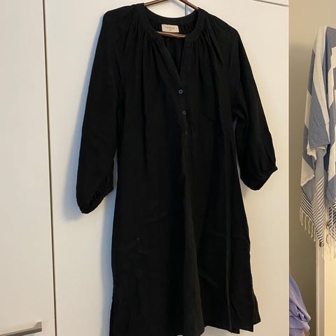 Erittäin hyväkuntoinen lyhyt mekko pitkillä, hiukan levenevillä hihoilla. Koko XL, niukka kuten Freequent yleensä. Laskeutuu kauniisti. 95 % polyesteriä ja 5 % elastaania.
