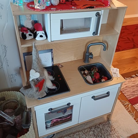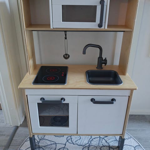 IKEA leikkikeittiö, jossa puunvärinen runko ja valkoiset ovet. Yläosassa on kaappi mikroaaltouunin näköisellä ovella ja avohylly säilytystä varten. Alakaapistossa on uunin näköinen ovi, kaappi sekä avohylly. Tasossa on kaksi keittolevyä ja muovinen allas hanalla. Keittiössä on myös tanko koukuilla keittiövälineiden ripustamiseen. Soveltuu lasten leikkeihin sisätiloissa.