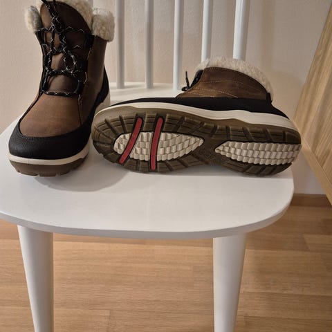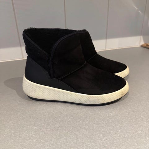 Ecco talvikengät, koko 38. Pitkävartinen malli, jossa nauhakiinnitys edessä. Väri musta. Päällinen mokkanahkaa, lämmin tekoturkisvuori. Pohjassa kuvioitu kumipohja, jossa Ecco-logot. Soveltuvat talvikäyttöön kaupunki- ja arkikävelyyn.