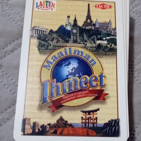 Maailman ihmeet -tietopelikortit. Pakka sisältää muovikotelossa olevia kortteja, joissa on valokuvia eri puolilta maailmaa sekä niihin liittyvää tietotekstiä. Kortit soveltuvat tietopeliin ja yleissivistävään käyttöön, esimerkiksi matkailu- ja maantietotiedon harjoitteluun. Teksti korteissa on suomeksi.