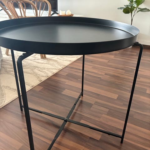 Pieni sivupöytä/kukkateline. Mustat metallijalat ja rottinkikori. Hyväkuntoinen.