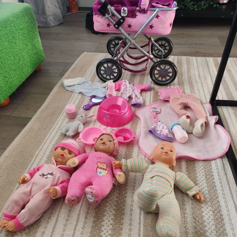 Isosiskonukke, sänky, potta, kantokassi ja muutamia vaatteita. Nuken hiukset takulla. Sängyn maalipinta kulunut, muuten tukeva ja ehjä.