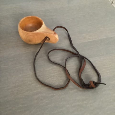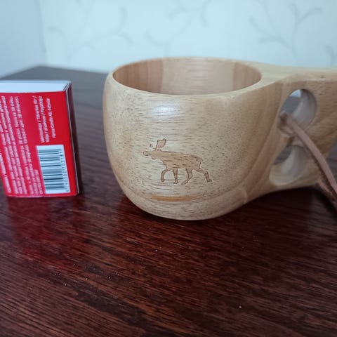 Käyttämättömiä . Kuksa puinen juomakuppi ulkoiluun ja retkeilyyn. Kuppi on valmistettu puusta ja siinä on nahkanyöri ripustamista tai kantamista varten. Soveltuu juomien nauttimiseen esimerkiksi vaelluksilla, retkillä ja muussa ulkoilukäytössä. Myydään kuvissa näkyvänä settinä, kaksi pientä ja kaksi isoa.