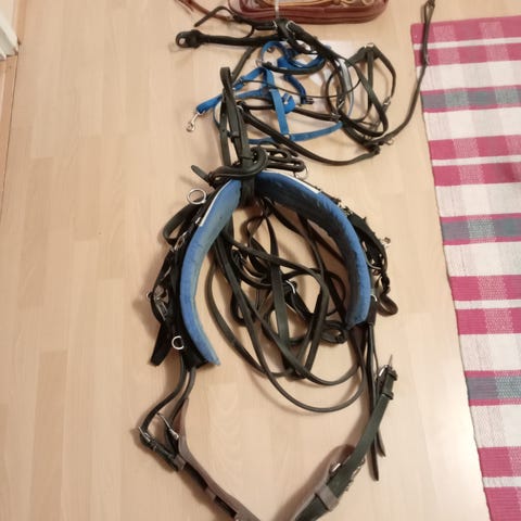 Käyttämättä jääneet silat perinteisellä hihnavaljastuksella. Mukana nyös rintaremmi, suitset ja ohjat.