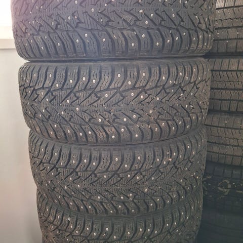 Uutena maksoi 700€+ Vianorilta alle asennettuna, eli nyt jo alle puoleen hintaan lähtee nämä oikeasti vähän ajetut renkaat, joissa noin 7,5mm pintaa jäljellä kaikissa renkaissa ja nastat tallella.