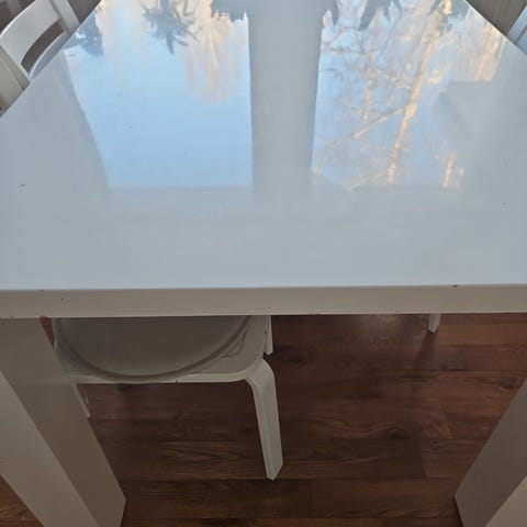 Ollut lapsiperheessä, joten pöydässä pinnassa mm. värijälkeä taiteiluista ja pientä kolhua. Yleisilme siisti, jos ei läheltä tutki. Tuoleissa sama, yleisilme OK, pesu jää ostajalle.
