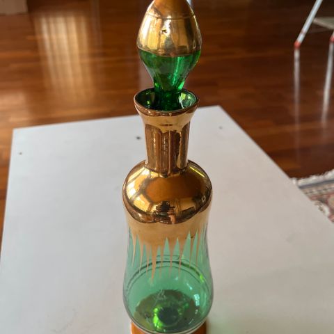 Vihreä lasinen pullo jossa korkki. Vaikka kylpyhuoneeseen koristeeksi.