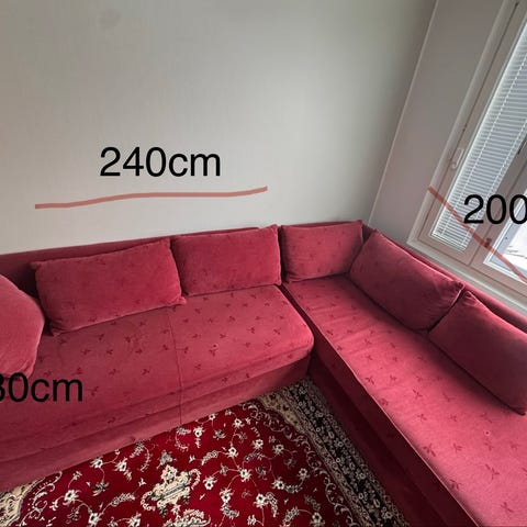 Tummanharmaa kulmasohva 240 x 240 ja istumasyvyys 90 cm.