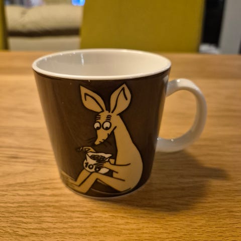Hyväkuntoinen Arabia Muumimuki, ruskea. Keraaminen kahva-muki, jossa Nipsu kuvitus.