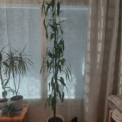 Myydään noin metrin mittainen viherkasvi muoviruukussa. Kasvin korkeus on noin 100cm. Kasvi on "onnenbambu".