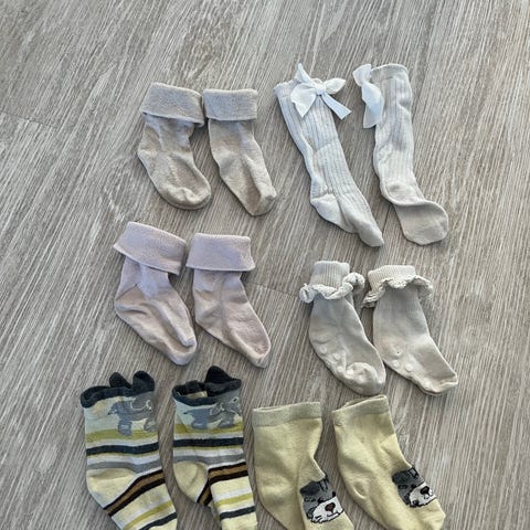Pieniä sukkia 7 paria. Kolmet ehkä Marimekkoa (en ole varma), kaksi paria ns. varrettomia Ryhmä Hau kuvalla. Ehjiä.