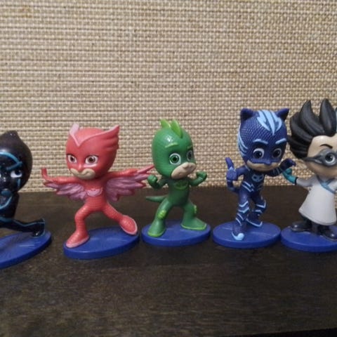 PJ Masks figuurit ja ajoneuvo. Setissä on viisi pientä muovista hahmofiguuria sekä punainen muovinen ajoneuvo. Figuurit ovat noin muutaman senttimetrin korkuisia, ja ne esittävät sarjan hahmoja eri väreissä. Ajoneuvossa on istumapaikka yhdelle hahmolle. Sopii leikkeihin ja kokoelmaan PJ Masks -teeman kanssa.