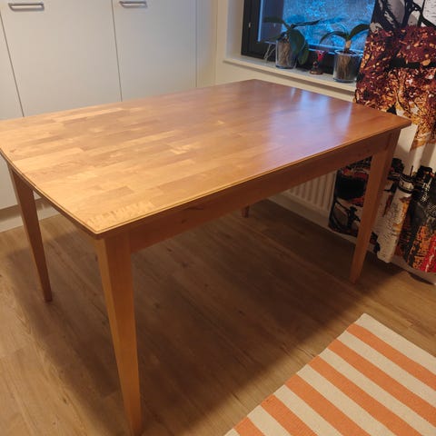 Tukeva, itse maalattu täyspuinen ruokapöytä. Maalipinnassa hieman kulumaa. Pöydästä saa jalat irti, nouto arabianrannasta.