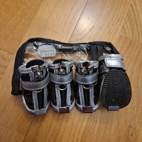 Rukka koiran kengät, koko 7. Kengät pysyvät hyvin jalassa ja niissä on heijastimet tuomaan lisänäkyvyyttä. Kolme kengistä on moitteettomassa kunnossa, mutta yhdestä on liimaukset pettäneet. Olleet käytössä australianpaimenkoiralla.