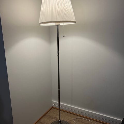 Siisti Ikea Årstid lattiavalaisin, jossa nikkelöity jalka ja valkoinen varjostin.