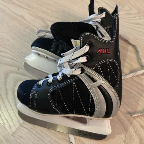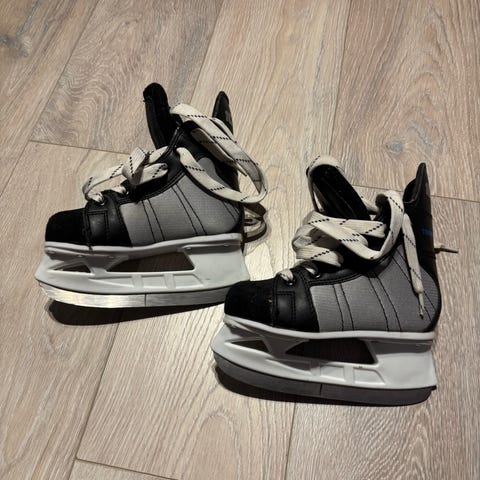 NHL 1000 lasten jääkiekkoluistimet, koko 29. Väritys musta-valkoinen. Luistimissa nauhakiinnitys ja terät jääkiekkokäyttöön. Sopivat lapselle jääkiekon harjoitteluun ja yleiseen luisteluun. Toisen luistimen kärjessä tekstiilissä pieni kulumajälki (ks. kuva).