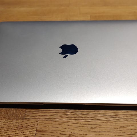 Apple MacBook kannettava tietokone. Hopeanvärinen runko ja musta näppäimistö. Soveltuu yleiseen tietokoneen käyttöön, kuten internet-selailuun, toimisto-ohjelmiin ja median toistoon. Kuvissa näkyy muovinen suojakuori kannen ja pohjan päällä sekä tarra kannessa. Tarkemmat tekniset tiedot, kuten näytön koko, prosessori, muisti ja tallennustila, eivät käy ilmi kuvista.