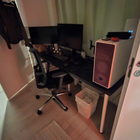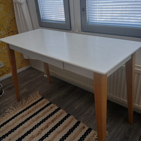 Ikean Linnmon/Adils työpöytä Ikean kuvakaappauksesta poiketen valkoinen levy harmailla jaloilla. Pöytälevy jonkin verran kulunut. Maksu mp:lla