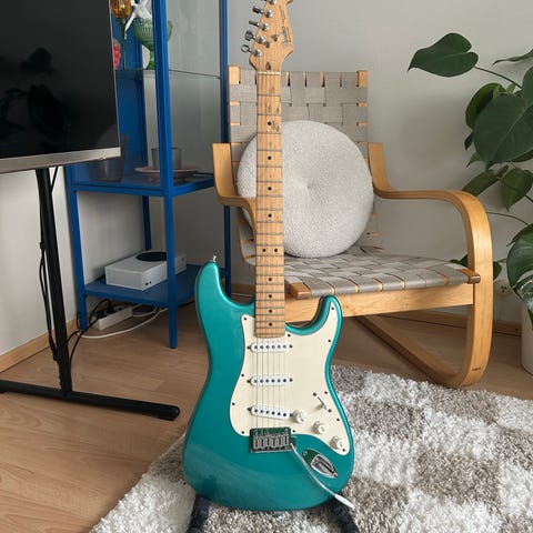 Vallan nätti ja perinteinen paremman pään mehikaani vuodelta 2007. Ruusupuuotelauta, 7,25” radius, C-profiilin kaula. Liput ja laput sekä loistokuntoinen Gatorin kova laukku (T-kaupassa toistasataa €:a). Nauhat OK. Bodyssa takapuolella kantissa jotain skraadua, etupuolella ihan vaatimaton dingi, jonka saa kiillottamalla pois. Ehkä ne muutkin saa, jos oikein haluaa.