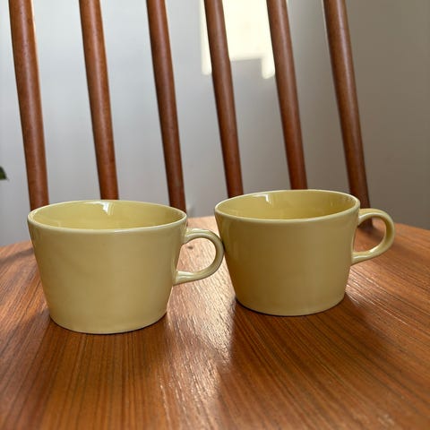 Arabia kupit keltainen keramiikka. Kaksi korvallista mukia, vaaleankeltaista lasitettua keramiikkaa. Soveltuvat esimerkiksi kahvin, teen tai muiden kuumien juomien tarjoiluun. Kupin halkaisija n. 8 cm ja korkeus n. 5,5 cm.