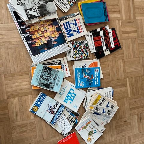 Meksikon MM-kisojen kangasmerkki, tamperelainen tennisklubin kangasmerkki ja vuoden 1989 jääkiekon MM-kisojen tarra. Käyttämättömiä. Tarra on vuosien saatossa ottanut taittumia.