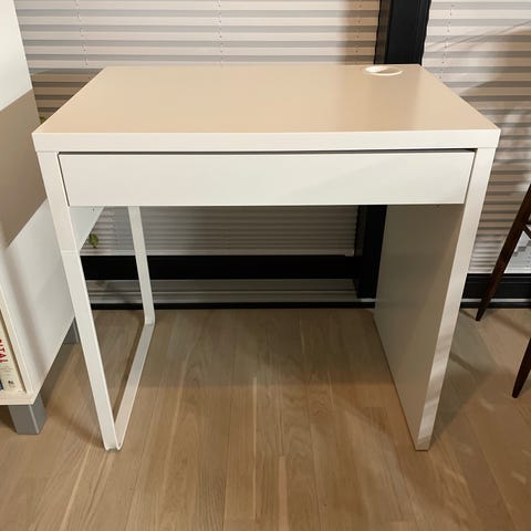 Pinkki-valkoinen työpöytä. Muuten hyvässä kunnossa, mutta pöytälevyssä on vähän pinta rikki (näkyy kuvassa).