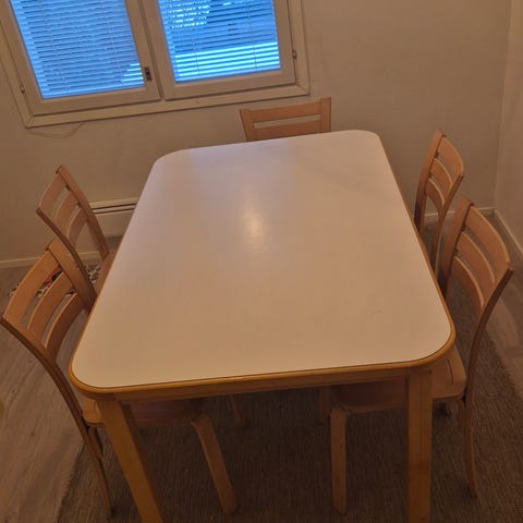 Annetaan valkoinen ruokapöytä. Hieman naarmua pöydän pinnassa. Nouto Hirvensalosta.