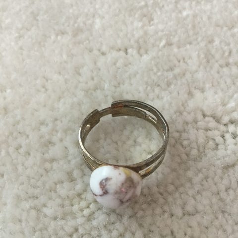 Sormus, valkoinen hiottu kivi, säädettävä koko ( n. 18 mm). Siistikuntoinen.