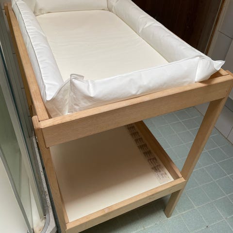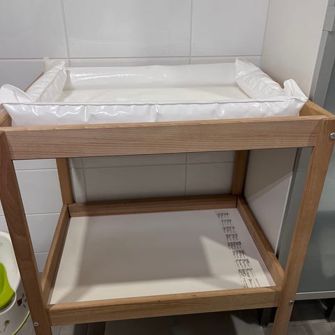 IKEAn SNIGLAR hoitopöytä. Hoitotaso ylhäällä ja alahylly säilytystä varten esimerkiksi vaipoille, vaatteille ja hoitotarvikkeille. Mukaan tulee tähän pöytään sopiva hoitoalusta (IKEAn SKÖTSAM) ja hoitopöytään kiinnitettävät säilytyskorit (3kpl). Joitain kolhuja voi löytyä mutta yleisesti siisti ja ehjä.