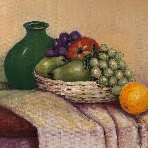 Myydään kaunis ja harmoninen öljymaalaus kankaalle, aiheena perinteinen asetelma (hedelmiä ja vihreä lasipullo). Teos on signeerattu EK.