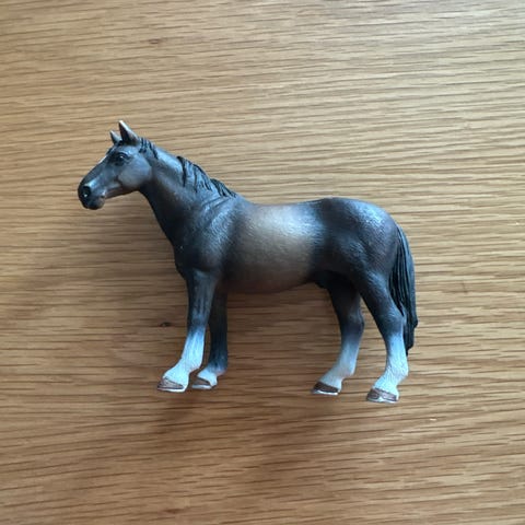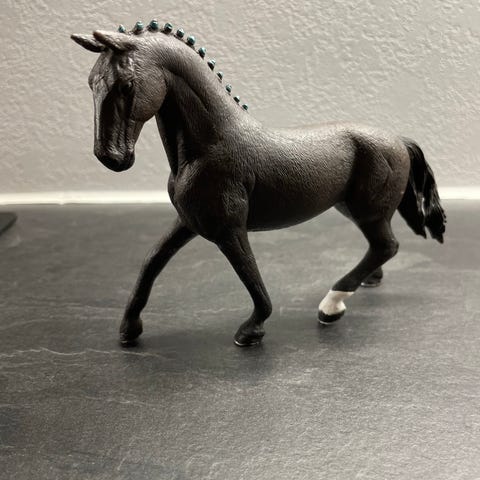 Schleich hevosfiguuri. Muovinen, yksityiskohtaisesti muotoiltu hevonen, väriltään tummanruskea/musta vaaleilla jaloilla ja vaalealla piirrolla päässä. Sopii lasten leikkeihin, kokoelmiin ja hevostallileikkeihin. Seisova/liikkeessä oleva asento, kiinteä ja kestävä rakenne.
