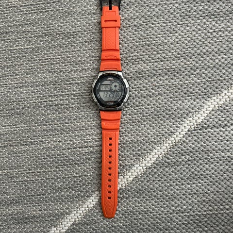 Casio digitaalinen rannekello unisex-käyttöön. Kellossa on digitaalinen näyttö ja muovinen oranssi ranneke, jossa on useita säätöreikiä istuvuuden mukauttamiseksi. Kellon kuori on pyöreä ja takakansi metallia. Sopii sekä naisille että miehille arkikäyttöön.