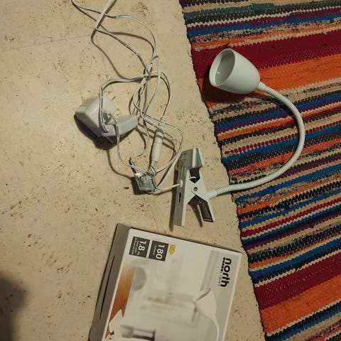 Myydään erittäin hyvässä kunnossa oleva "hopeinen" pöytävalaisin, jossa on pitkä varsi, jota pystyy sekä pyörittämään että vääntämään eri suuntiin. Laitetaan kiinni pistorasiaan ja valaisimen yläosassa on päälle/pois-vipu.