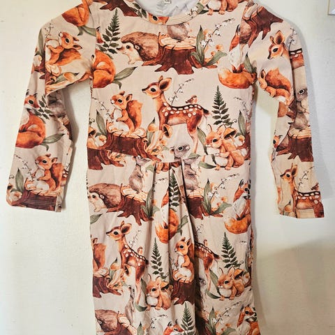 Kaunis, upea sävyinen kuviointi, maalattu kukkakuvio. Napikas merkkinen, koko 128. Yhden tytön käyttämä. Valmistettu Suomessa.