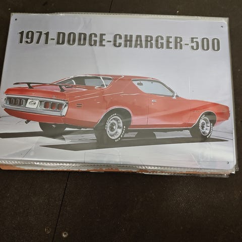 Dodge Challenger R/T 1971 metallikyltti, jossa mustavalkoinen kuva autosta ja teksti "1971-Dodge-Challenger-R-T". Kyltissä on kiinnitysreiät kulmissa, ja se soveltuu esimerkiksi autotallin, harrastetilan tai seinän sisustuselementiksi. Materiaali on metallia ja pinta on kiiltävä. 30cm leveä ja 20cm korkea.