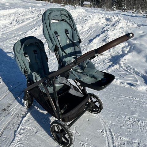 Cybex sisarusrattaat mustalla kangasverhoilulla. Rattaissa on kaksi istuinosaa, viisipistevaljaat ja turvakaaret. Runko on nelipyöräinen ja työntöaisa on yhtenäinen. Mukana on erillinen musta vaunukoppa vastasyntyneelle. Sopii kahden eri-ikäisen lapsen kuljettamiseen, toinen istuu ylemmässä ja toinen alemmassa istuimessa tai vaunukopassa. Mukaan tulee ostoskori, mukiteline ja sadesuojat.