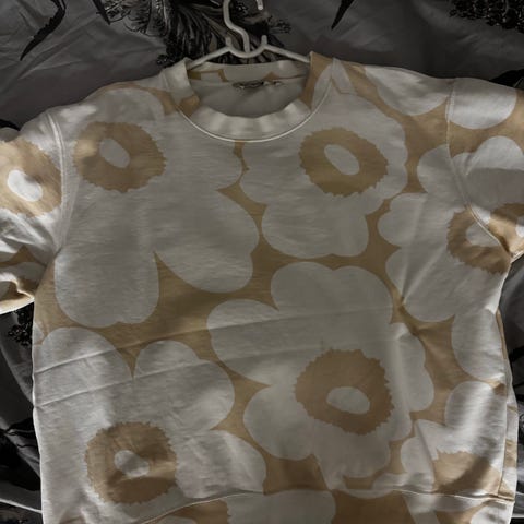 Marimekon ihana Kasvio paita unikkokuosilla. Väri luonnonvaalea. Halkiot sivuilla ja tasku rinnassa. Varanappi käyttämättä. Vastaa kokoaan xl.