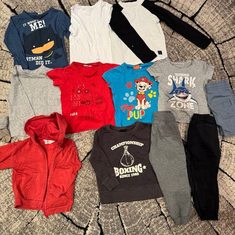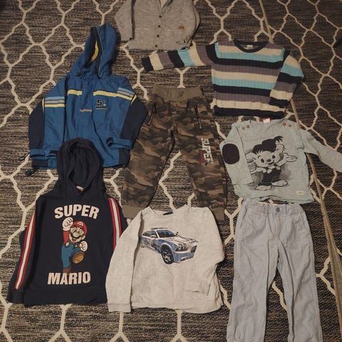 poikien vaatepaketti, koko 98-104. Pakettiin kuuluu useita erilaisia vaatteita, kuten pitkähihaisia puseroita sekä housuja. Vaatteissa on erilaisia kuoseja ja värejä, esimerkiksi kuvioituja ja yksivärisiä malleja. Koko sopii noin 98-104 cm pituiselle lapselle. Paketti on tarkoitettu pojille ja sisältää arkeen sopivia vaatteita. Vaatteet on uutena ostettu ja yhdellä lapsella pidetty, kunto ok.