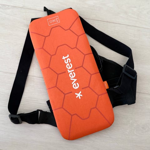 Scott Airflex selkäpanssari koossa M. Suunniteltu 170–180 cm pituiselle käyttäjälle. Väri pääosin musta, taustassa oranssit ilmanvaihtoaukot. Selkäpanssarissa on säädettävät olkaimet ja leveä tarrakiinnitteinen lantiovyö istuvuuden säätöön. Suoja on valmistettu joustavasta ja iskuja vaimentavasta D3O-materiaalista, ja siinä on hengittävä, rei’itetty rakenne. CE-hyväksytty selkäsuoja standardin EN 1621-2:2014 mukaisesti, soveltuu esimerkiksi pyöräilyyn ja muuhun lajiin, jossa tarvitaan selän suojausta.