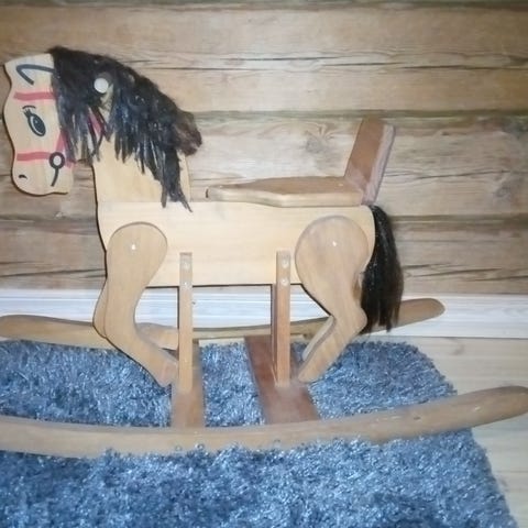 Ihana hevonen lapselle, jossa myös pyörät, joten hevonen lisäksi liikkuu ja keinuu paikallaan. Korkeimmasta kohtaa 87cm, matalampi kohta 62-63cm, kokonaisleveys n. 40cm, pituus n.93cm.