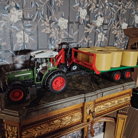 Bruder kuormain paalipihdeillä ja heinäpaaleilla