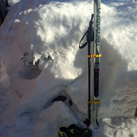 Käytön jäljet näkyy ja maali vähän kupruille suksen kärjessä.