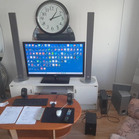 Kirjahylly ja tietokone ja televisio ja kaiuttimet