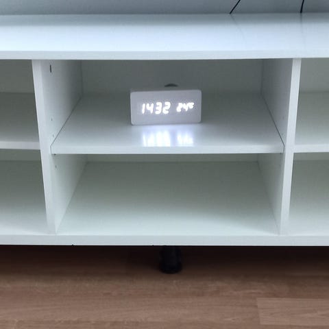Ruskea puinen tv-taso. Tasossa on leveä kansitaso televisiolle sekä avohyllyjä ja laatikoita säilytykseen. Sopii olohuoneeseen viihde-elektroniikan ja pientavaroiden säilyttämiseen.
