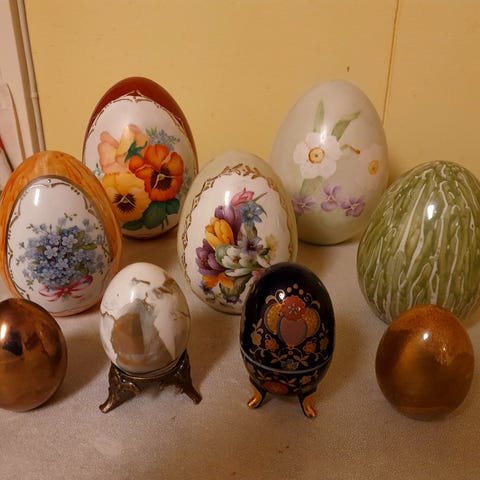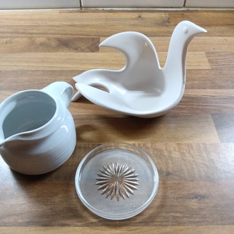 Pieni valkoinen posliininen, helmiäishohtoinen simpukka- koriste. Ilmeisesti alunperin suolakko tms., koska pohjassa tulpan sulkema aukko. Käyttämätön ja erittäin hyväkuntoinen.