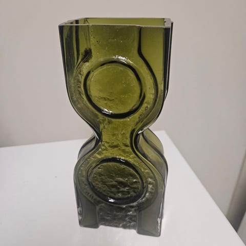Helena Tynellin suunnittelema Riihimäen lasin valmistama " Kaappikello" maljakko. Malli 1305. Valmistettu v.1966. Keltainen. Väri määritetty harvinaiseksi.