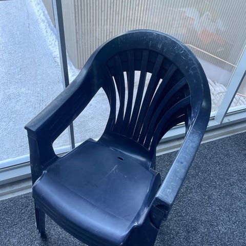 Annetaan piha keinutuoli. Tyyny on hieman haalistunut auringosta.