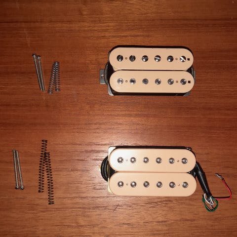 Kaulamikki DP103CRU ja tallaan DP223FCRU. Talla siis F-spaced, mutta ollut minulla ESP Viperissä ja napapalat osuivat kielten alle mainiosti esteettisessä mielessä. Johdot täysimittaiset. Ruuveja ja jousia ei valitettavasti tule mukaan.