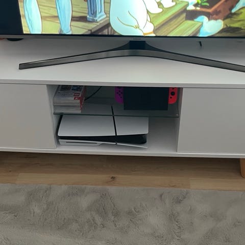 Hyväkuntoinen ja siisti korkeakiiltoinen valkoinen tv-taso. Muutamassa kohdassa pientä kulumaa (kts. esimerkit kuvat 4-5).