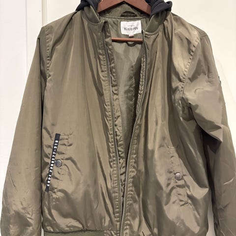 Hyväkuntoinen, ehjä välikausitakki irrotettavalla hupulla edessä kokopitkä vetoketju sivuilla vetoketju taskut.
